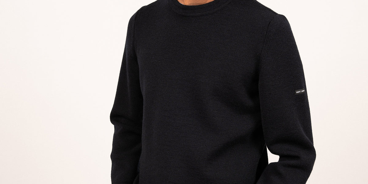SAINT JAMES SWEATER IN WOOL | Saint Laurent | YSL CH。Men's Navy Crew Neck Sweater, English Rib Knit, Saint James。Loup de mer jumper with zipped high neck, in soft wool。
